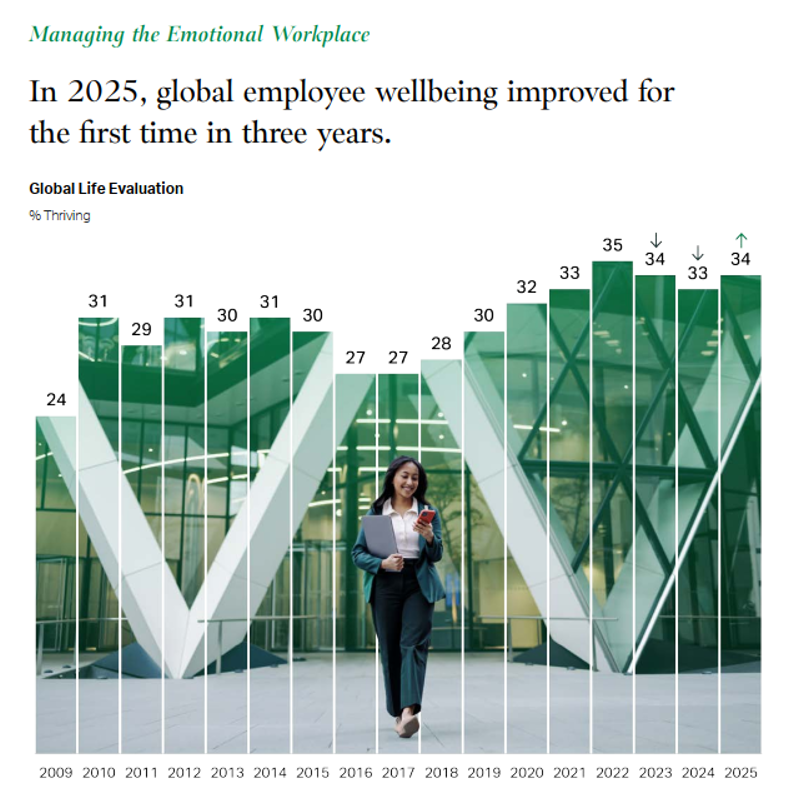 - Evaluación de Vida (EE. UU. y Canadá): El 51% de los trabajadores se considera en estado de «prosperidad» (thriving), mientras que un 4% se encuentra en estado de «sufrimiento» (suffering). Los empleados en estado de prosperidad reportan significativamente menos problemas de salud, estrés y tristeza.